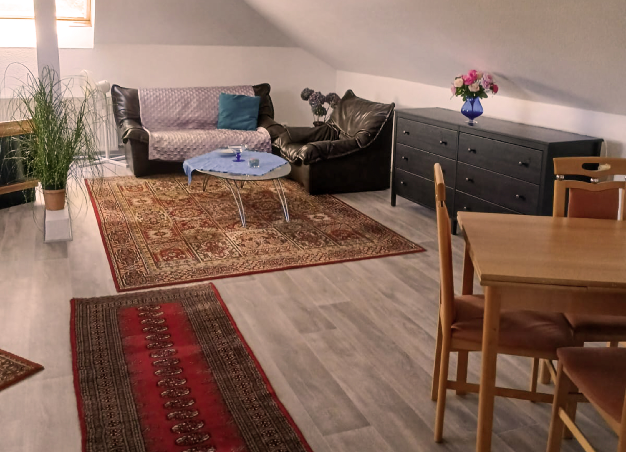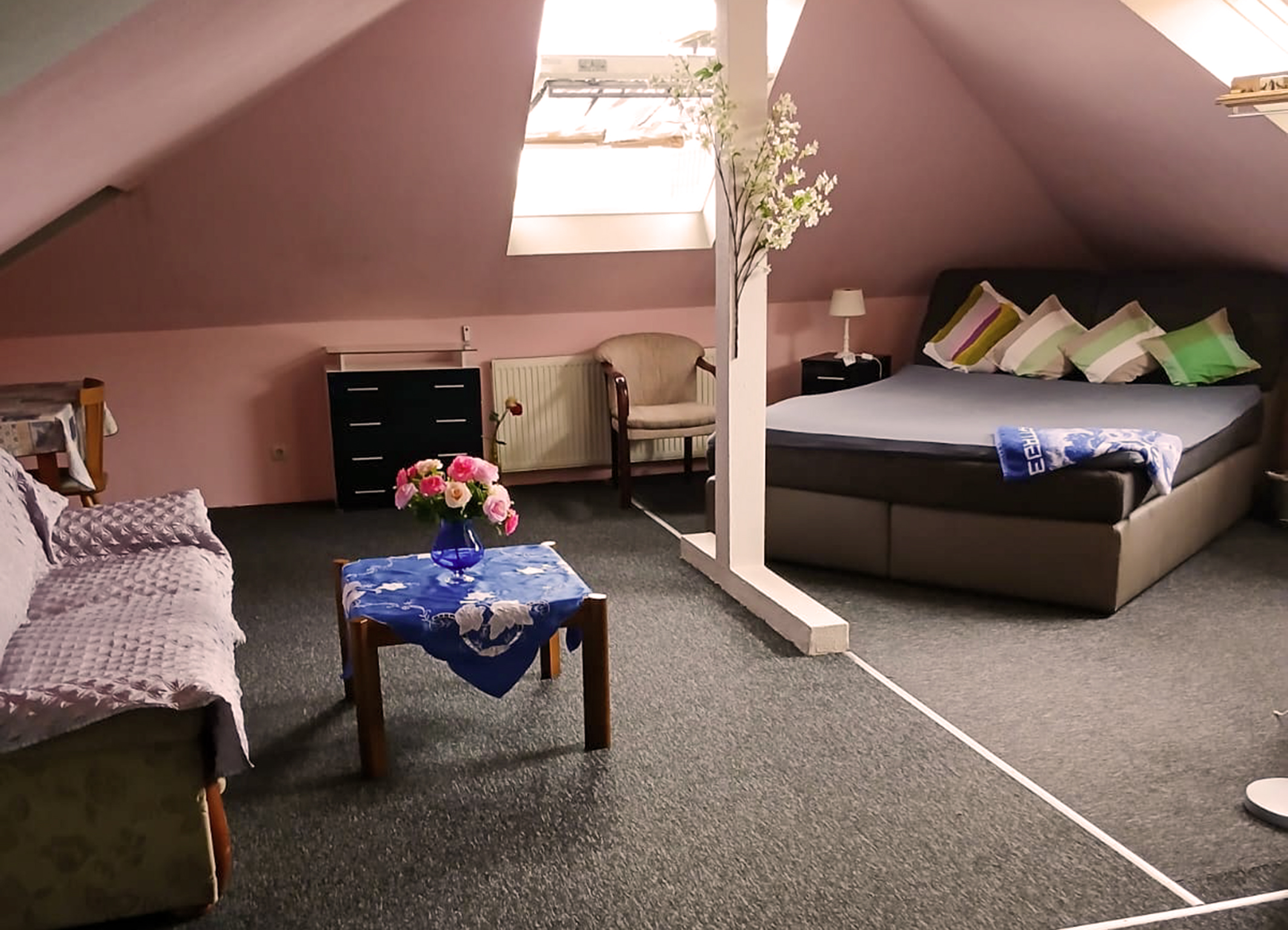 Das Apartment liegt im Dachgeschoss und ist ca. 45m2 groß. Es ist mit einem großen Bett und einem ausgestattet. Das Apartment beinhaltet unter anderem eine Dusche und Toilette. Handtücher und Duschgel Vorhanden. Alles was zum Entspannen und Genießen einlädt. Mit einladender Beleuchtung und einem gepflegten Ambiente schaffen wir den perfekten Rahmen für unvergessliche Momente voller Sinnlichkeit.